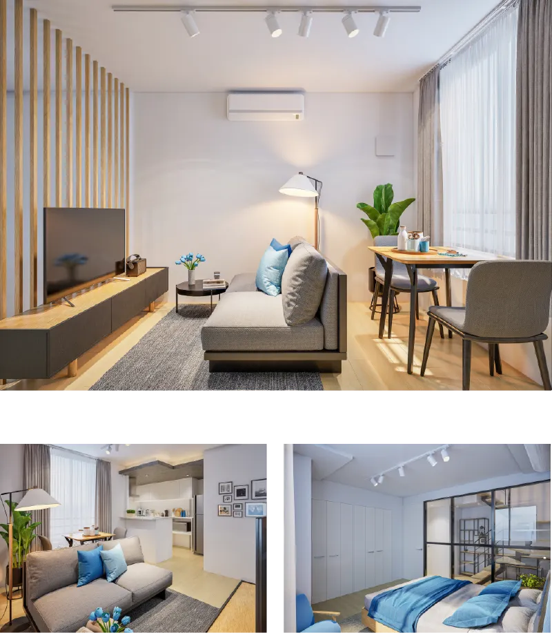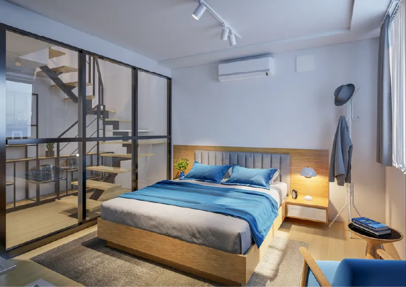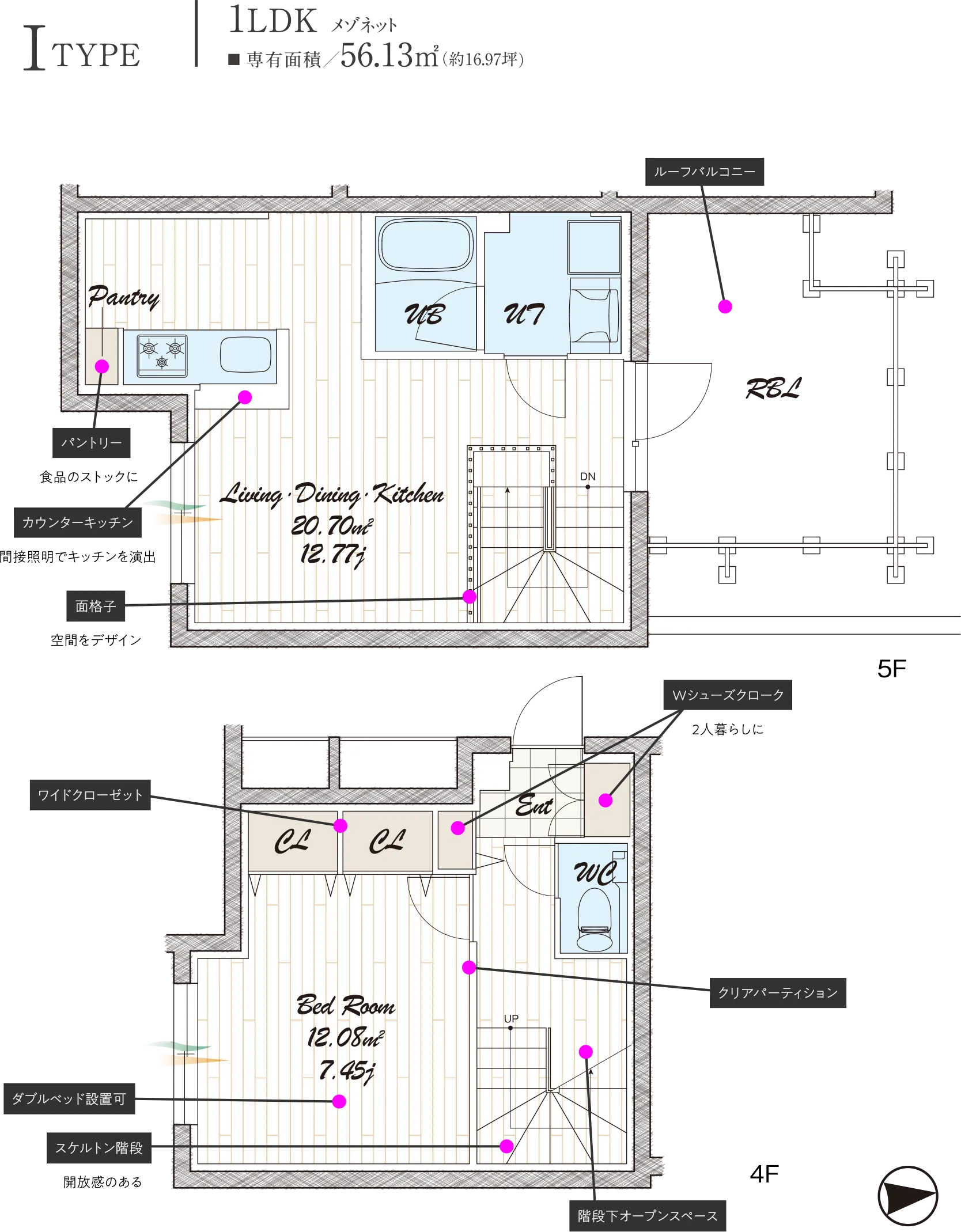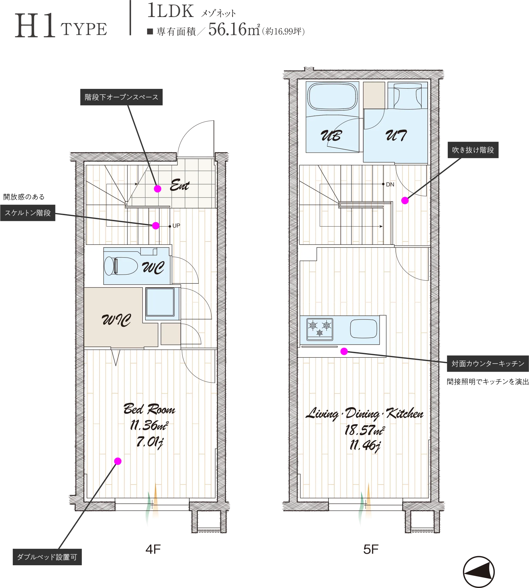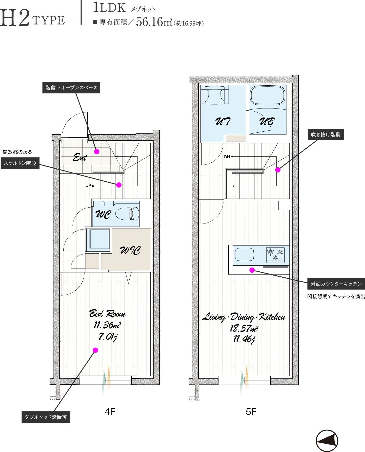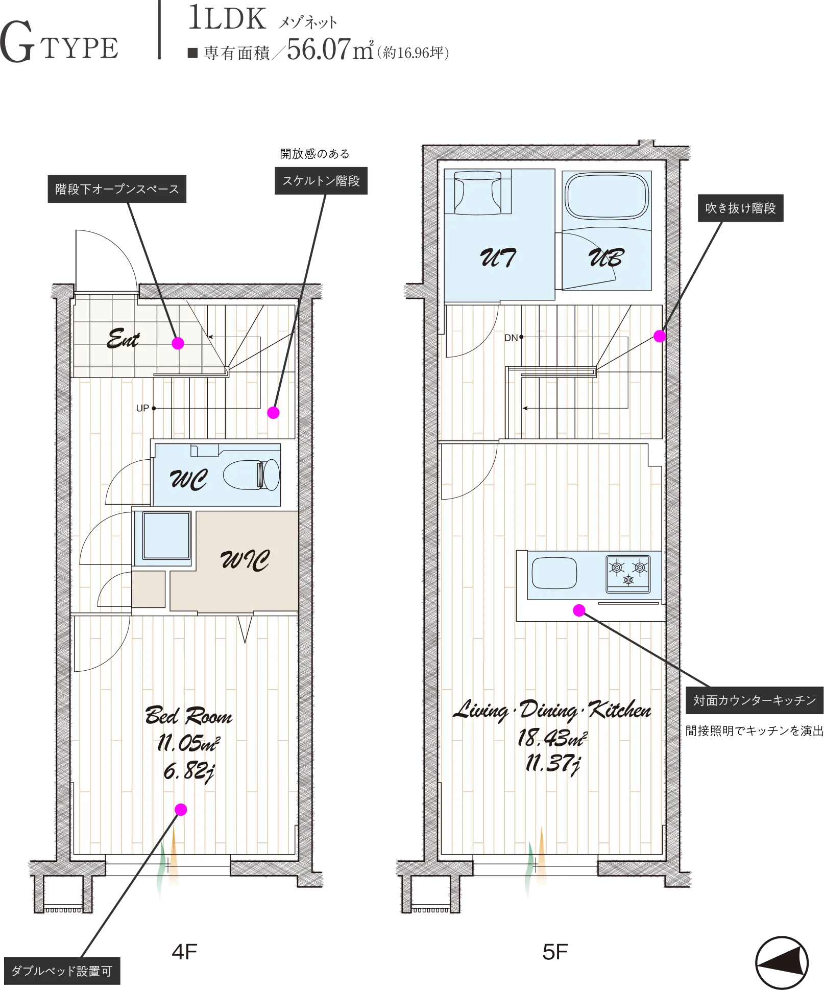 最上階には5タイプのメゾネット住戸、吹き抜けや階段が演出する立体的な広がりと開放感を楽しむ暮らし。上下階をつなぐ空間のリズムが、ふたりの毎日をもっと豊かに、もっと自由に。