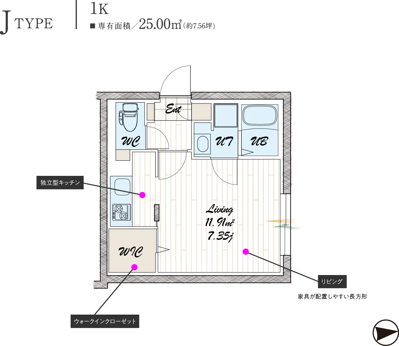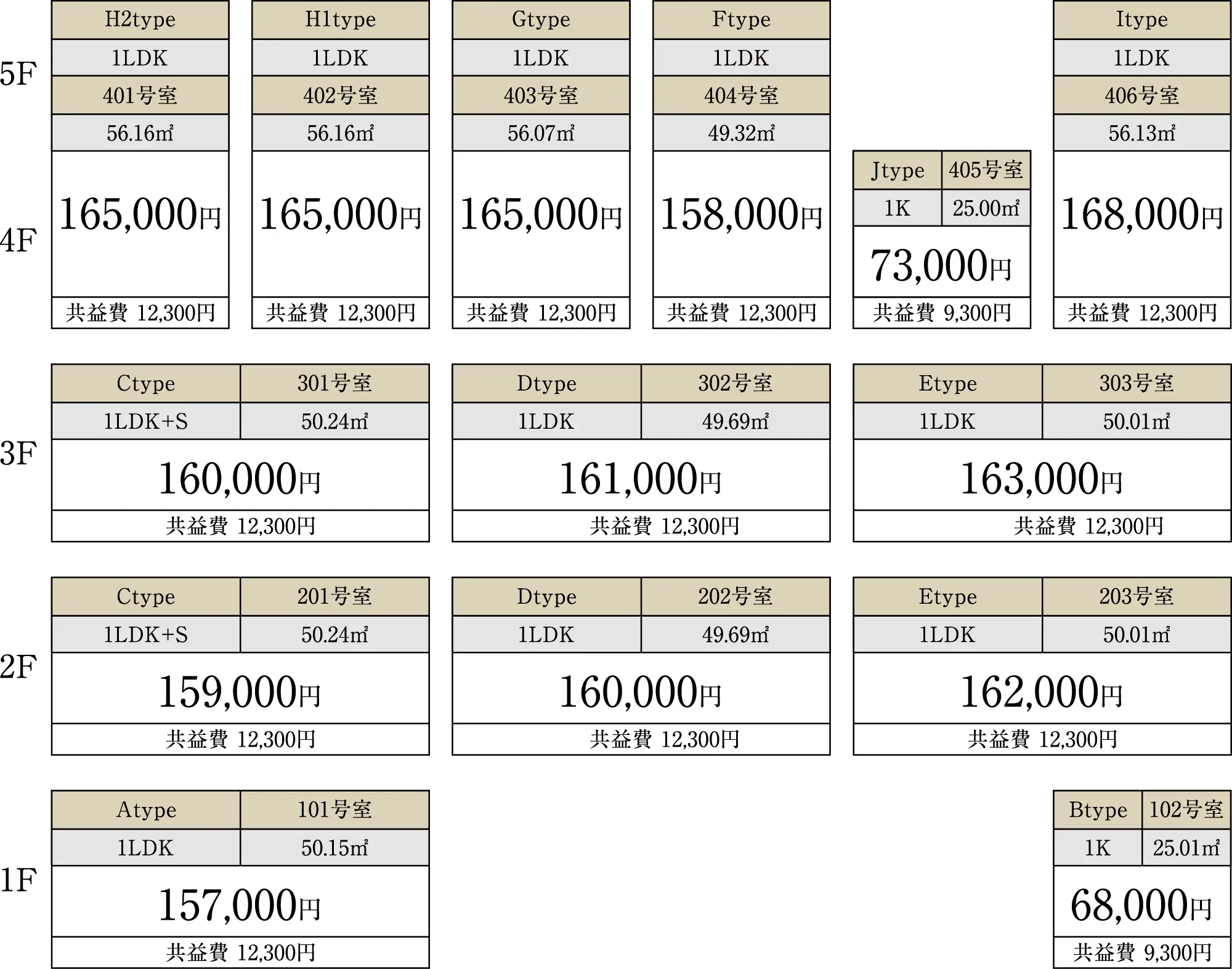 1K(25.00㎡~25.01㎡)、1LDK(49.69㎡~50.15㎡)、