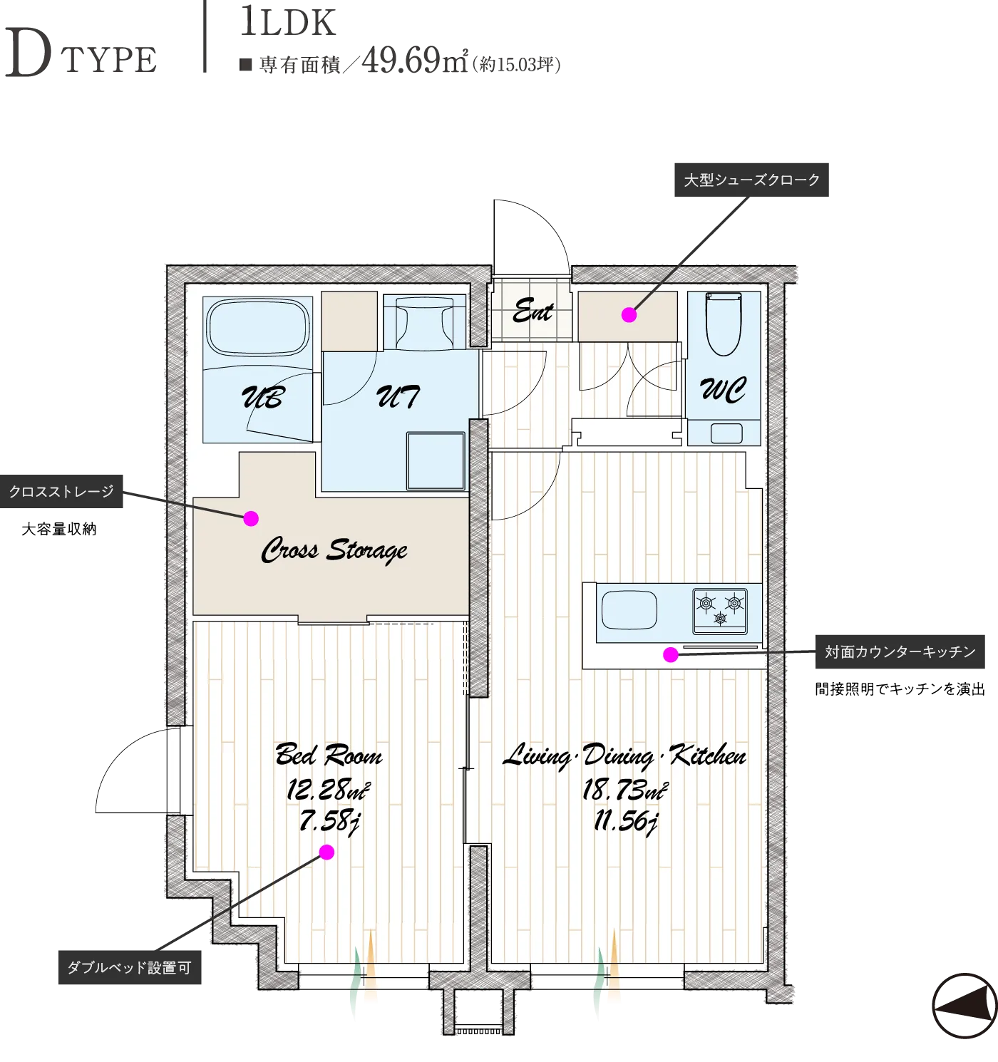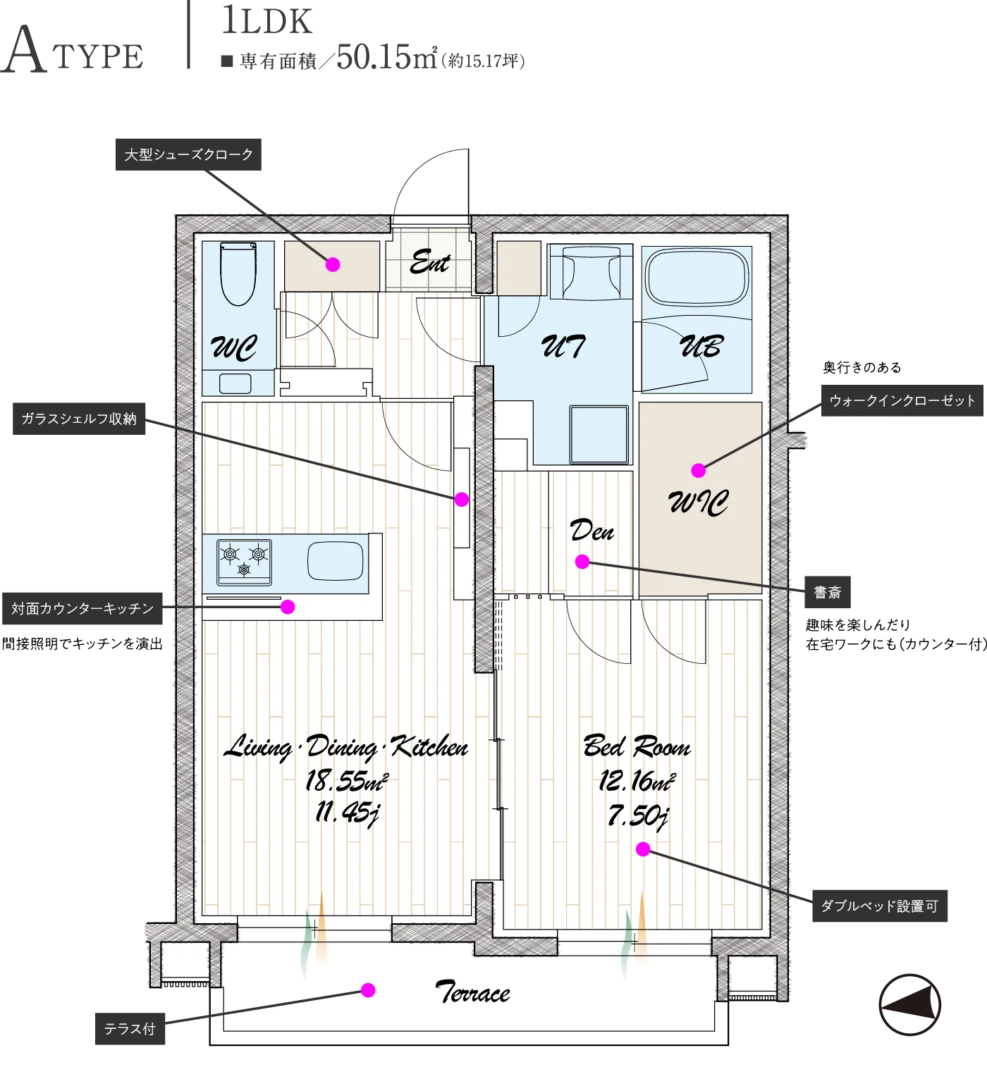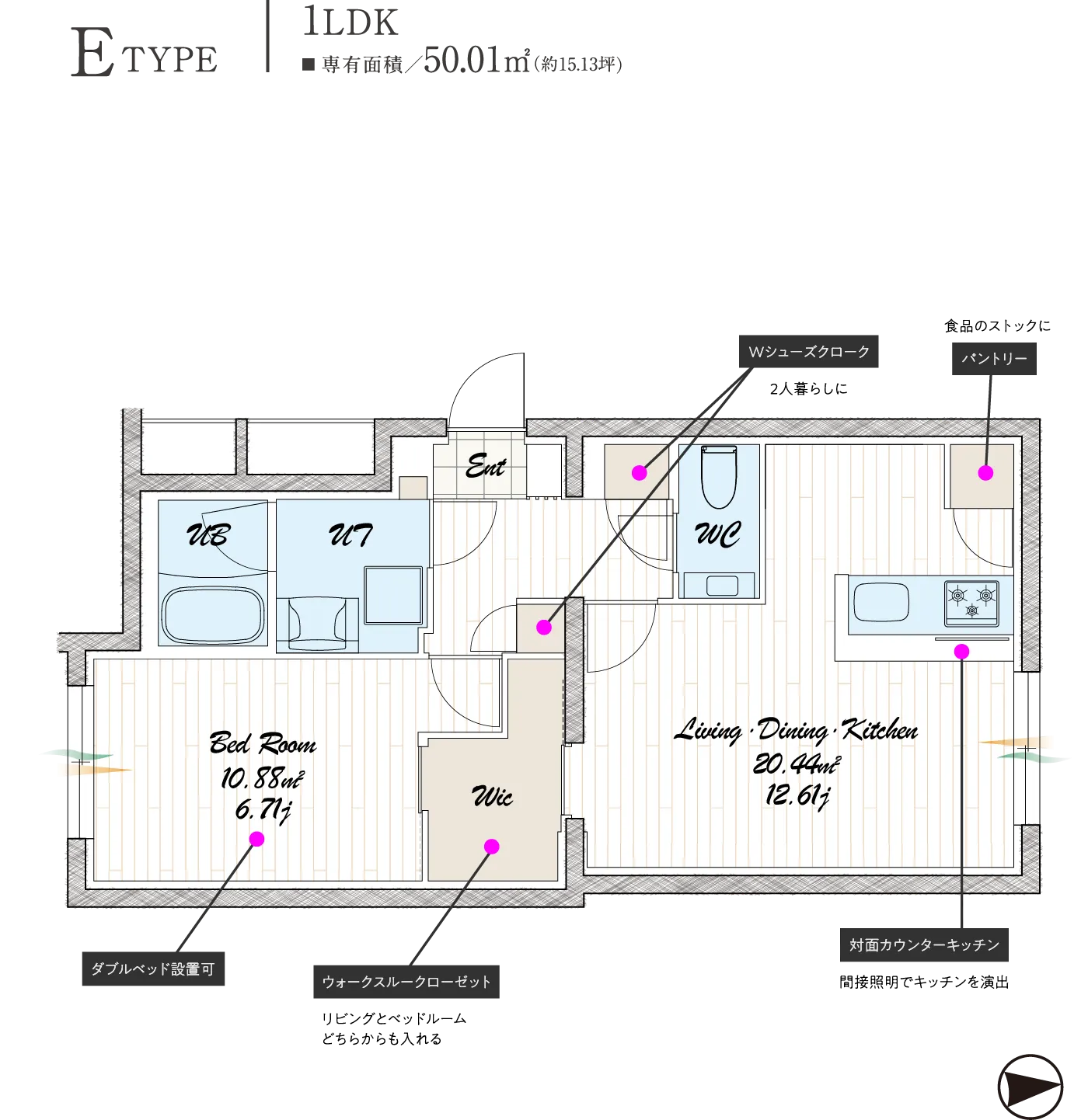 約50㎡の広さが叶える、贅沢な日常。壁式構造で柱や梁のない空間を演出。
